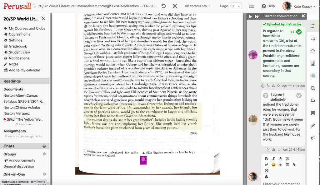 In Perusall, the text and the conversation are in the same place. Students and professor (as a whole class or in small groups) look at the same copy of the text and annotate it with their questions and comments. Everyone can also type a response to a given comment or “upvote” it. In these comment threads, my students challenged each other’s interpretations, answered each other’s questions, and noted further implications of their peers’ ideas. They interacted directly with each other rather than directing all of their speech to me, as sometimes happens in the classroom. The conversations in these comment threads were more interactive than I’ve generally seen in CMS discussion boards and involved higher-order thinking skills than I had seen from these students in face to face conversations.